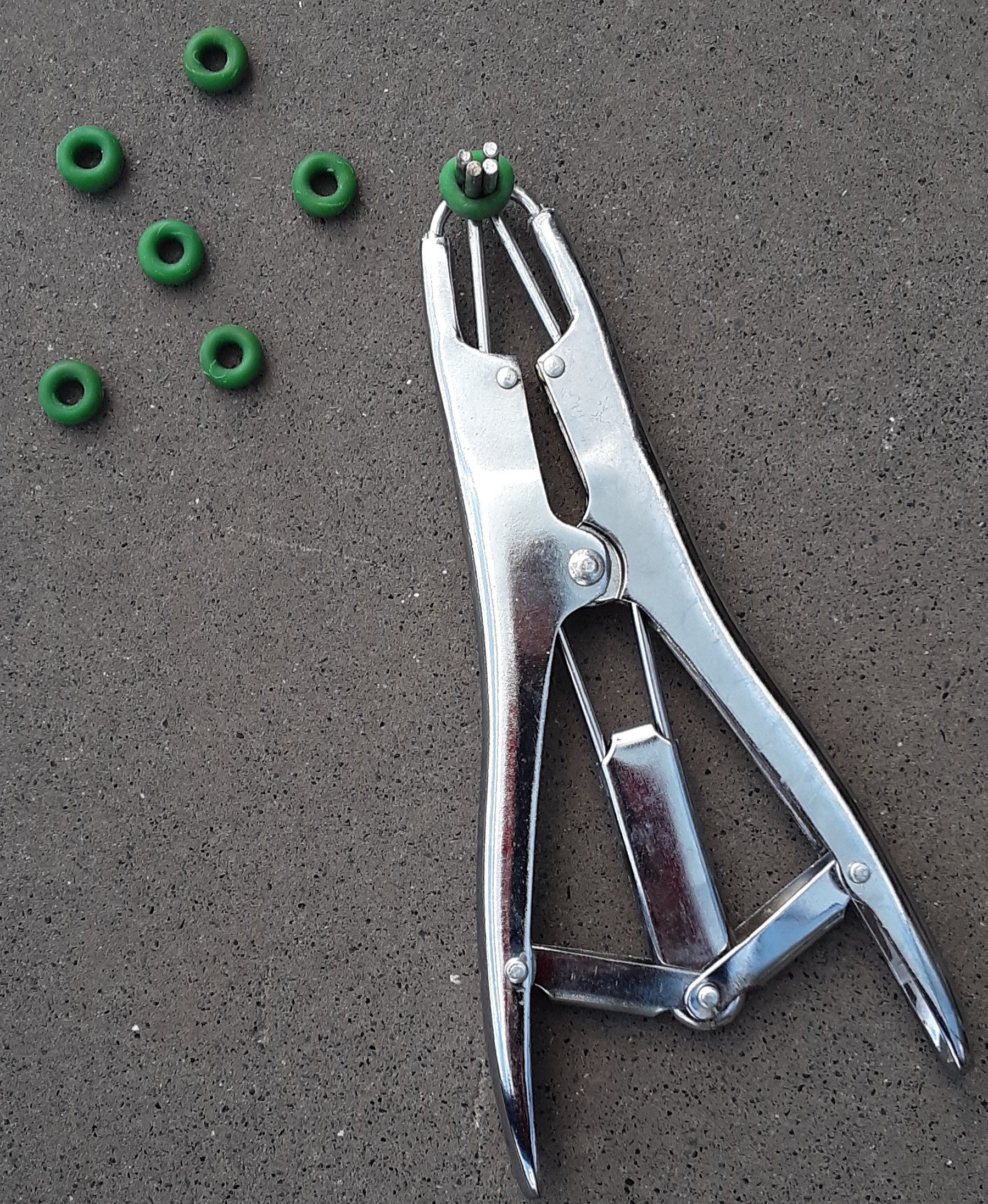 Banding is a process of placing a band above the scrotum, close to the abdomen, entrapping both spermatic cords. An elastrator tool is used to apply an elastrator band (Figure 3) to smaller calves  and other banding tools are used for larger bulls. The band restricts blood supply to the testicles and scrotum causing the scrotum and testicles to shrivel and fall off. Banding is associated with a high incidence of missed testicles as operators fail to check for the presence of both testicles in the scrotum before the band is applied.