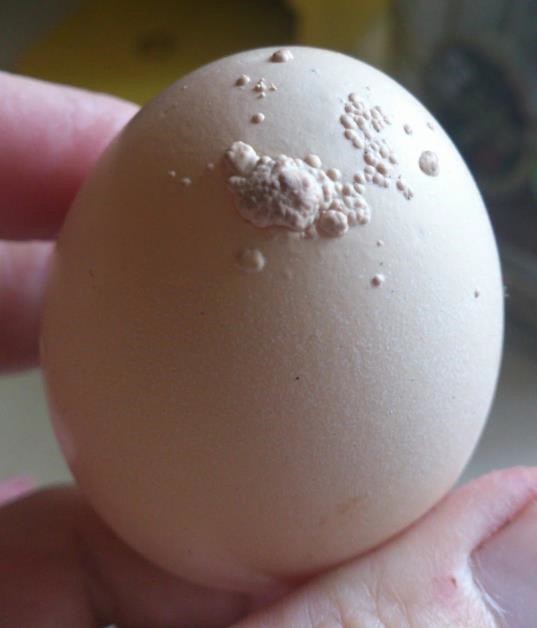 As hens mature, shell deformities such as calcium deposits and thin spots will be produced. If an egg is cracked while in the uterus, the hen will “patch” the egg with additional calcium.